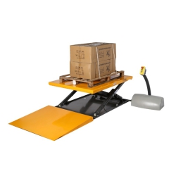 Adecuada para nivelar sus cargas, esta mesa elevadora extraplana no supera los 82 mm en posición baja.